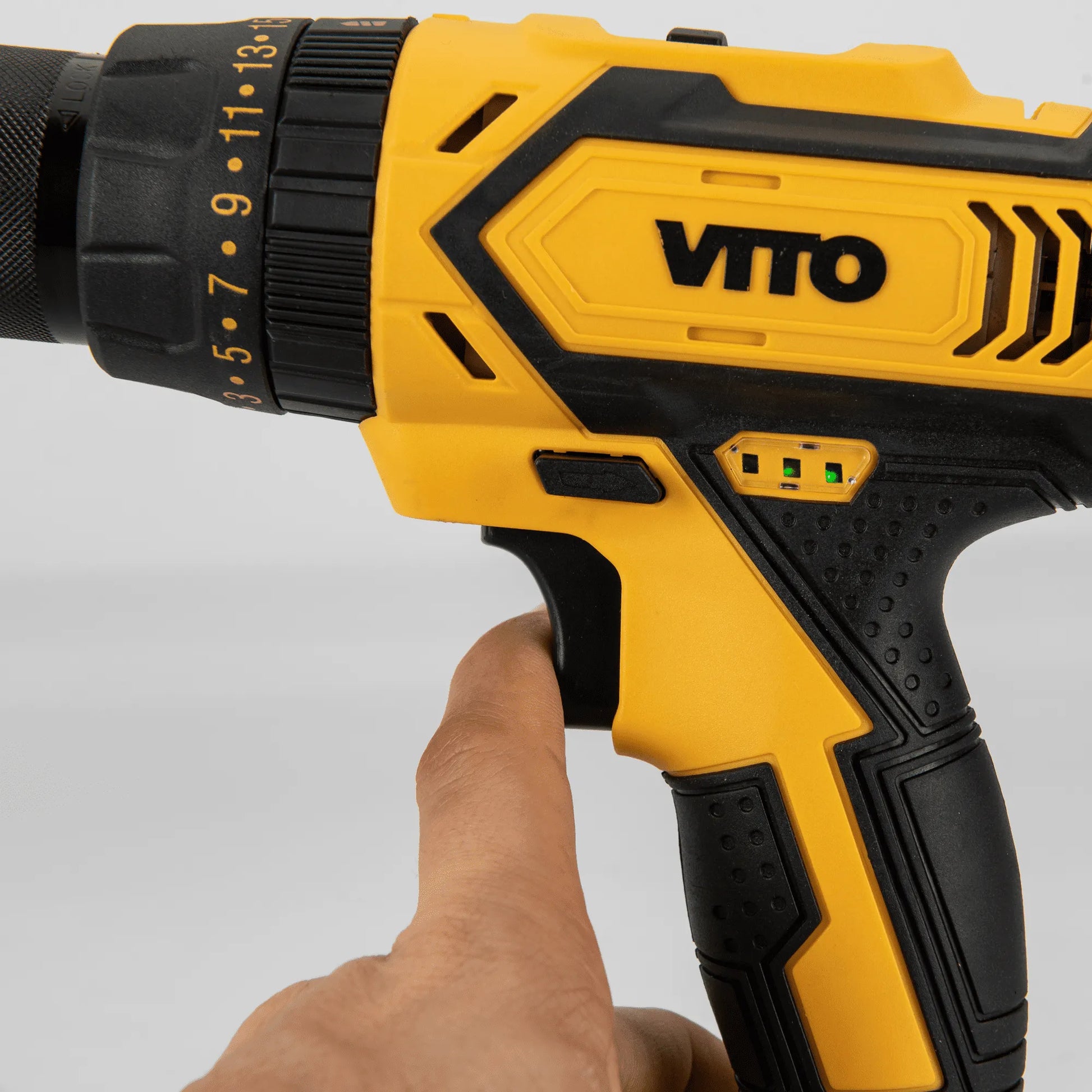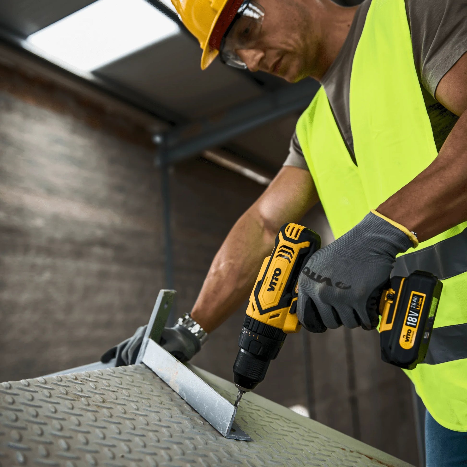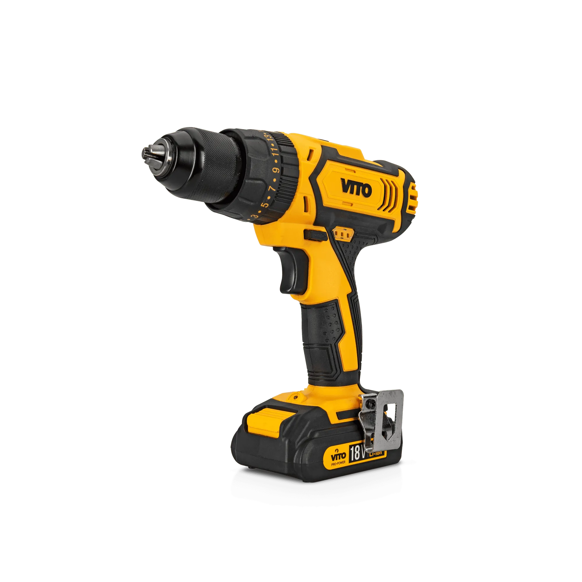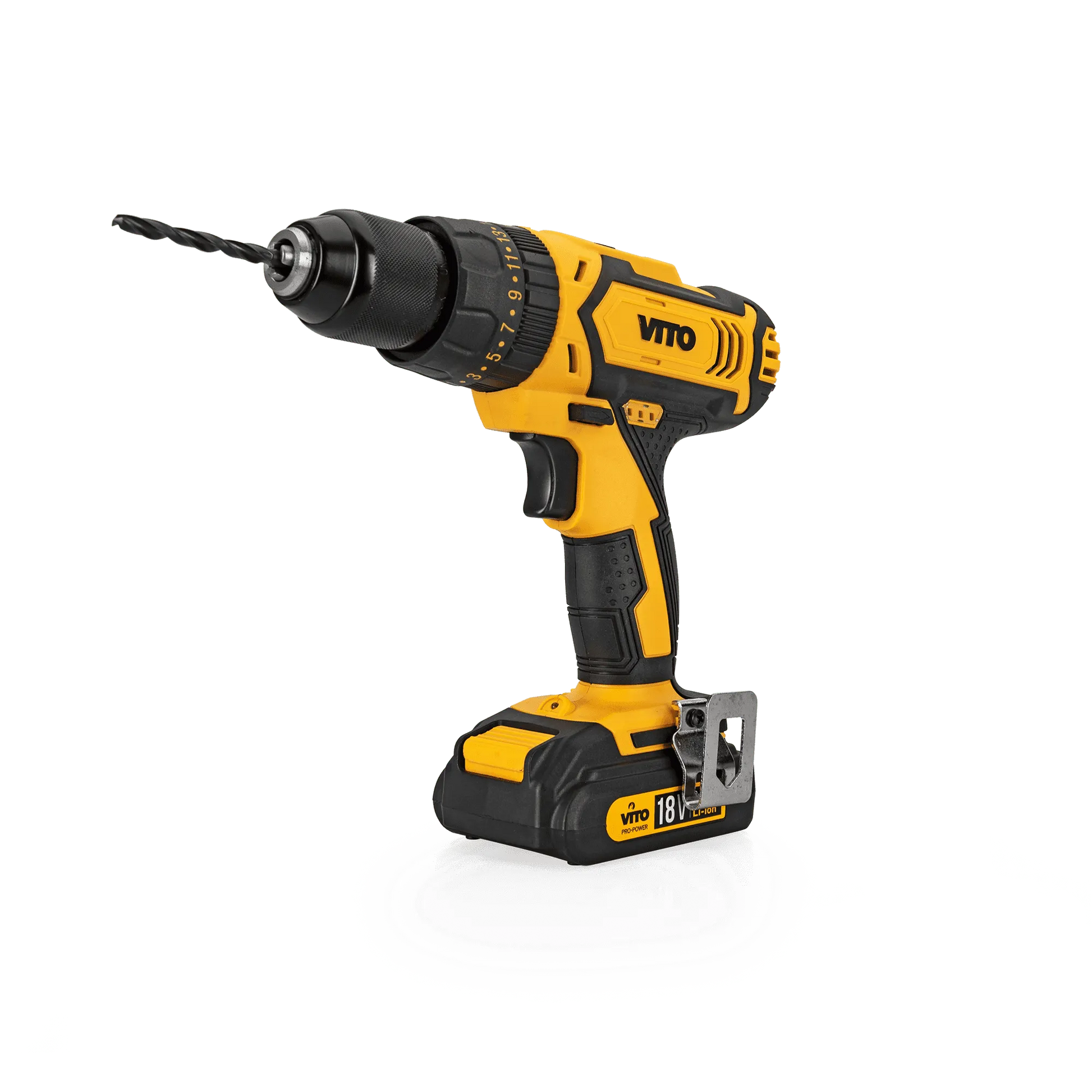 Berbequim de Percussão sem Fios, com uma tensão nominal de 18V e uma capacidade de bateria de 2Ah, tem 2 Velocidades, Velocidade de Rotação em Vazio de 0-400 e 0-1550rpm.